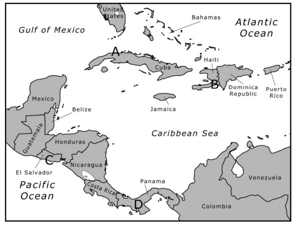 Which letter on the map indicates the location of the Isthmus of Panama?