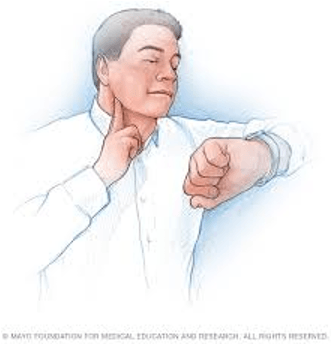 Take your index and middle finger and place them on the side of your neck, near your throat (like in the picture below). You should feel your skin beating.