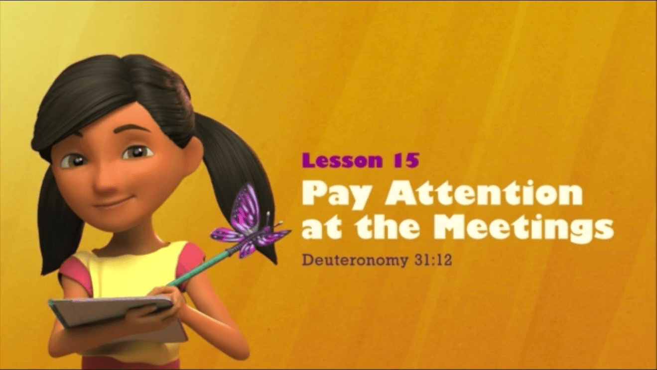 In Lesson 15, Pay Attention at the meetings, What were Caleb and Sophia doing that showed they were not paying attention at the meeting?