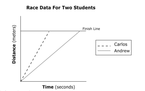 Carlos and Andrew decided to race each other home from school. The graph below shows the motion of the boys during the race. Which best describes the race?