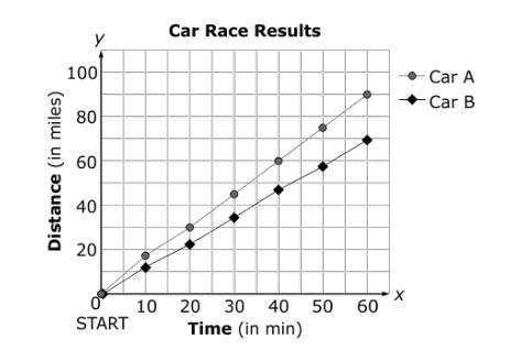 This graph represents two cars that were in a race. After one hour, how much faster was car A traveling than car B?