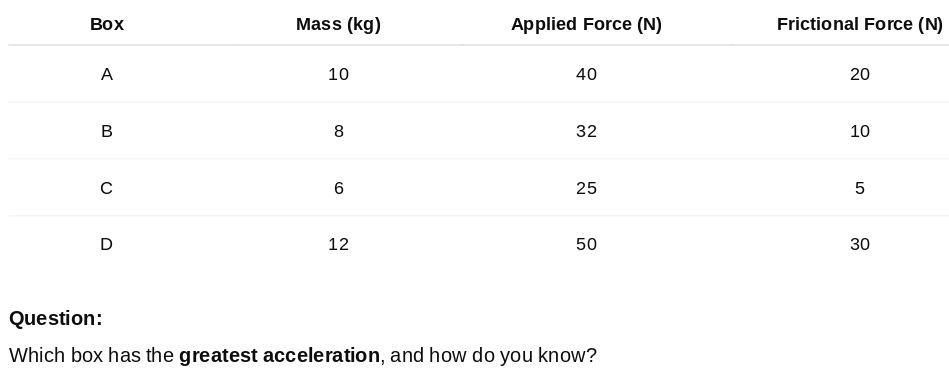 A 25 kg box is pushed with 200 N of force. Friction resists with 50 N. What is the acceleration?