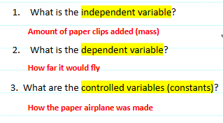 A student wanted to test how the mass of a paper airplane affected the distance it would fly. Paper clips were added before each test flight. As each paper clip was added, the plane was tested to determine how far it would fly.